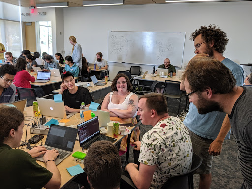 The primary instructor (standing in front) driving the lesson with the lesson webpage and terminal while a mentor (bottom, long blond hair) helps debug a specific issue with a participant (bottom right, long black hair)